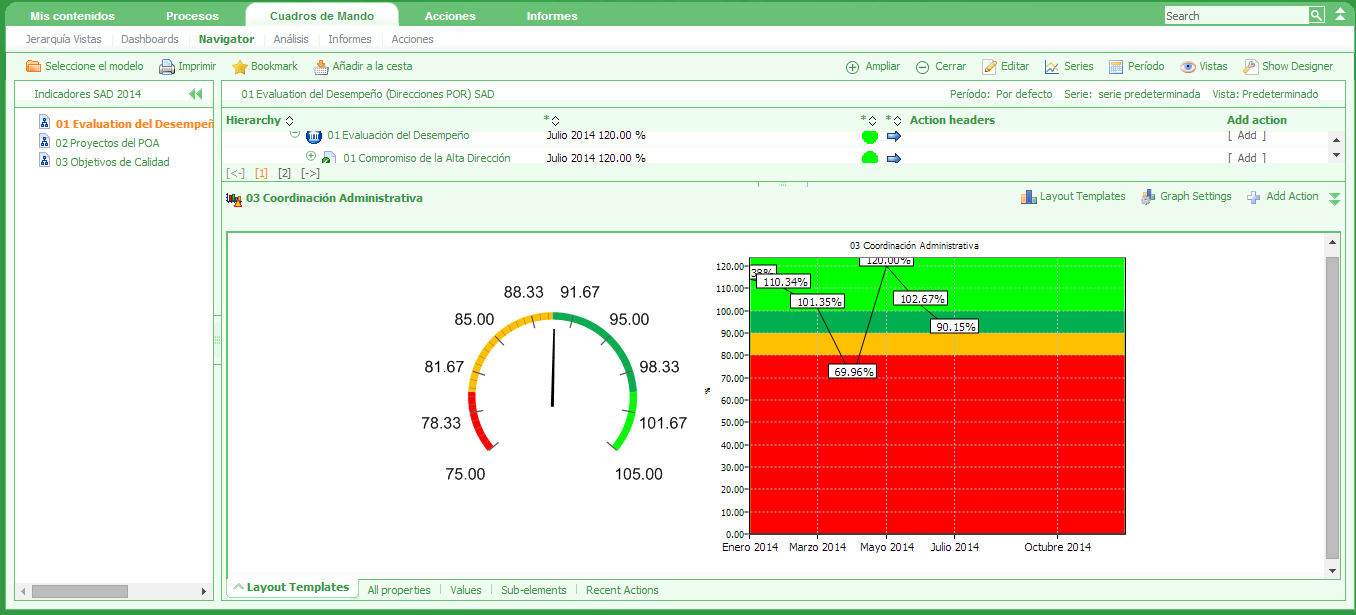 Uno de los objetivos clave del modelo de gestión es legitimar el modelo y el uso de las herramientas de apoyo. Por lo tanto el proceso se refleja en un procedimiento en el que se realiza un corte mensual de los indicadores operativos y trimestrales o anualmente de los otros niveles de indicadores. Además, el seguimiento mensual de los indicadores ofrece una oportunidad para que los empleados realicen su propio análisis de las causas de las desviaciones y hacer una justificación por escrito y / o proponer una solución para atender las diferencias, cuando el indicador no alcanza la meta mínima de 80%. En consecuencia, la información también ofrece el análisis de las causas que explica cómo y por qué ha sobrepasado la meta de 100%. La captura mensual de nivel operativo se refleja en el procedimiento de “Planeación y Programación del POA P-STE-01”. Este procedimiento POA está documentado y es parte del procedimiento de operación de la propia Secretaría, demuestra el uso correcto del sistema de gestión. Esto permite que represente el beneficio para la evaluación de la unidad y de los procesos de toma de decisiones, y facilita la revisión por la dirección como se describe en el procedimiento para el Control y Seguimiento de la Revisión Directiva. En última instancia, el logro de la filosofía de gestión como el cumplimiento de sus indicadores se refleja en la forma de cómo el procedimiento POA está vinculado a las diferentes actividades y niveles de todo el personal, y la forma en que la revisión de la Directiva detecta y corrige las desviaciones que puedan surgir a lo largo de una determinada línea de tiempo.